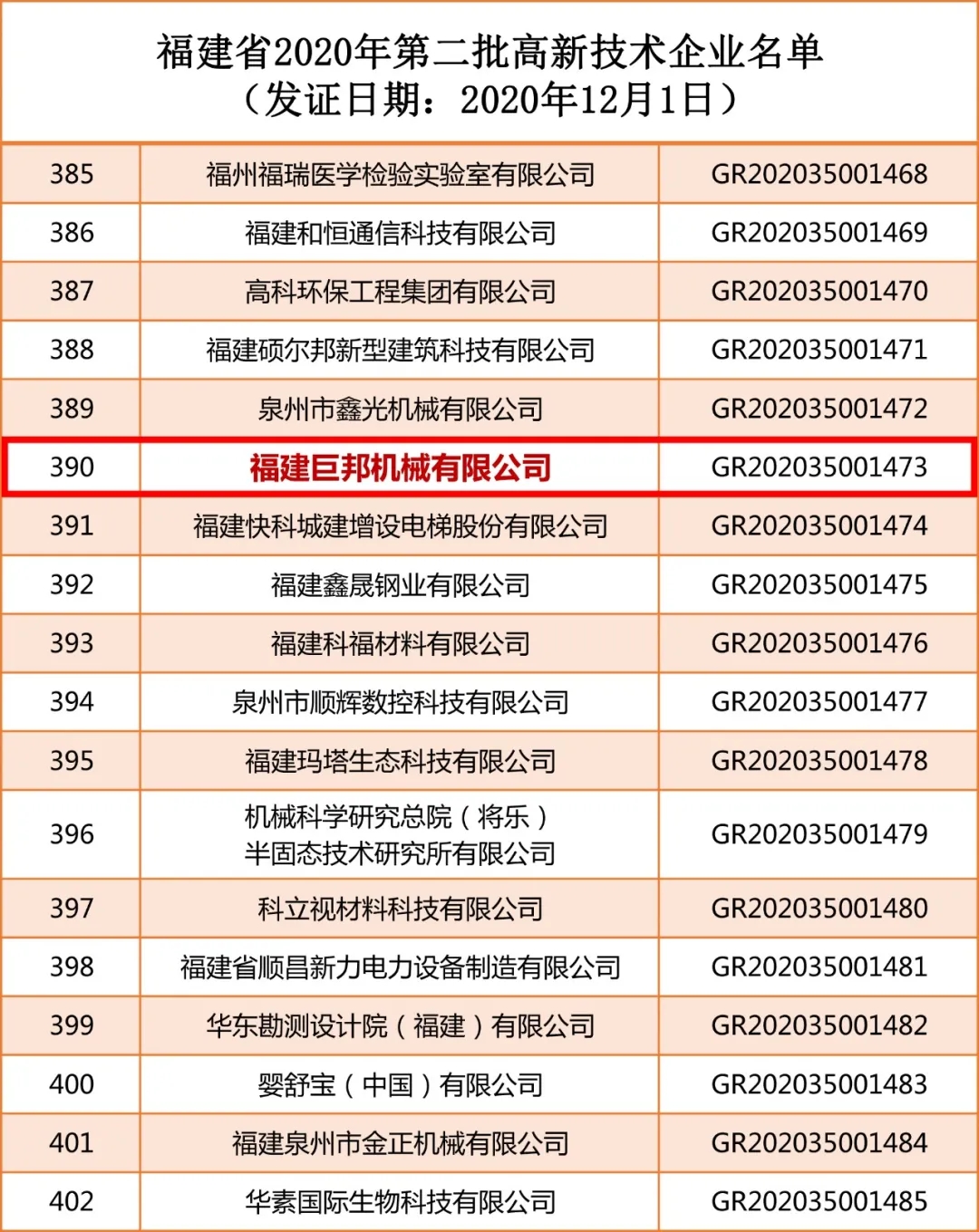 巨邦機械上榜福建省2020年第二批高新技術企業(yè)名單