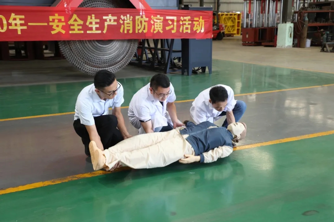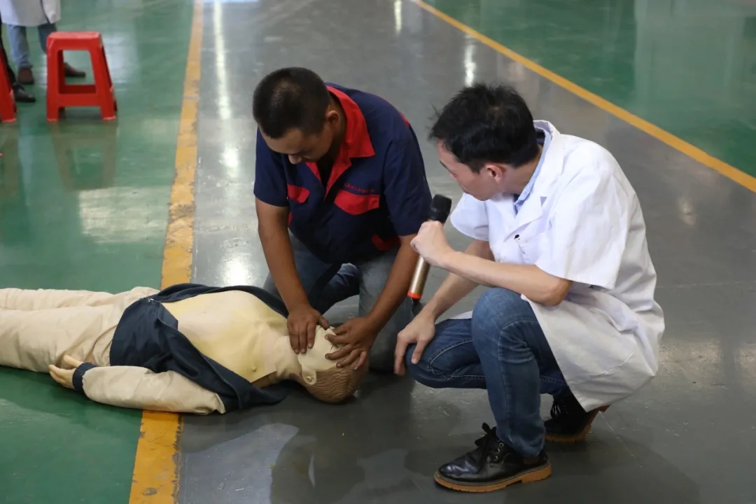 緊接著,巨邦全體員工移步車間機(jī)臺(tái)展示區(qū),由泉州濱海醫(yī)院提供醫(yī)療講座。外科專家為員工們講解一一和演示了外傷包扎、心肺復(fù)蘇、工傷院前急救,模擬火災(zāi)救護(hù)人員場(chǎng)景,員工安全防范能力有了進(jìn)一步提高。